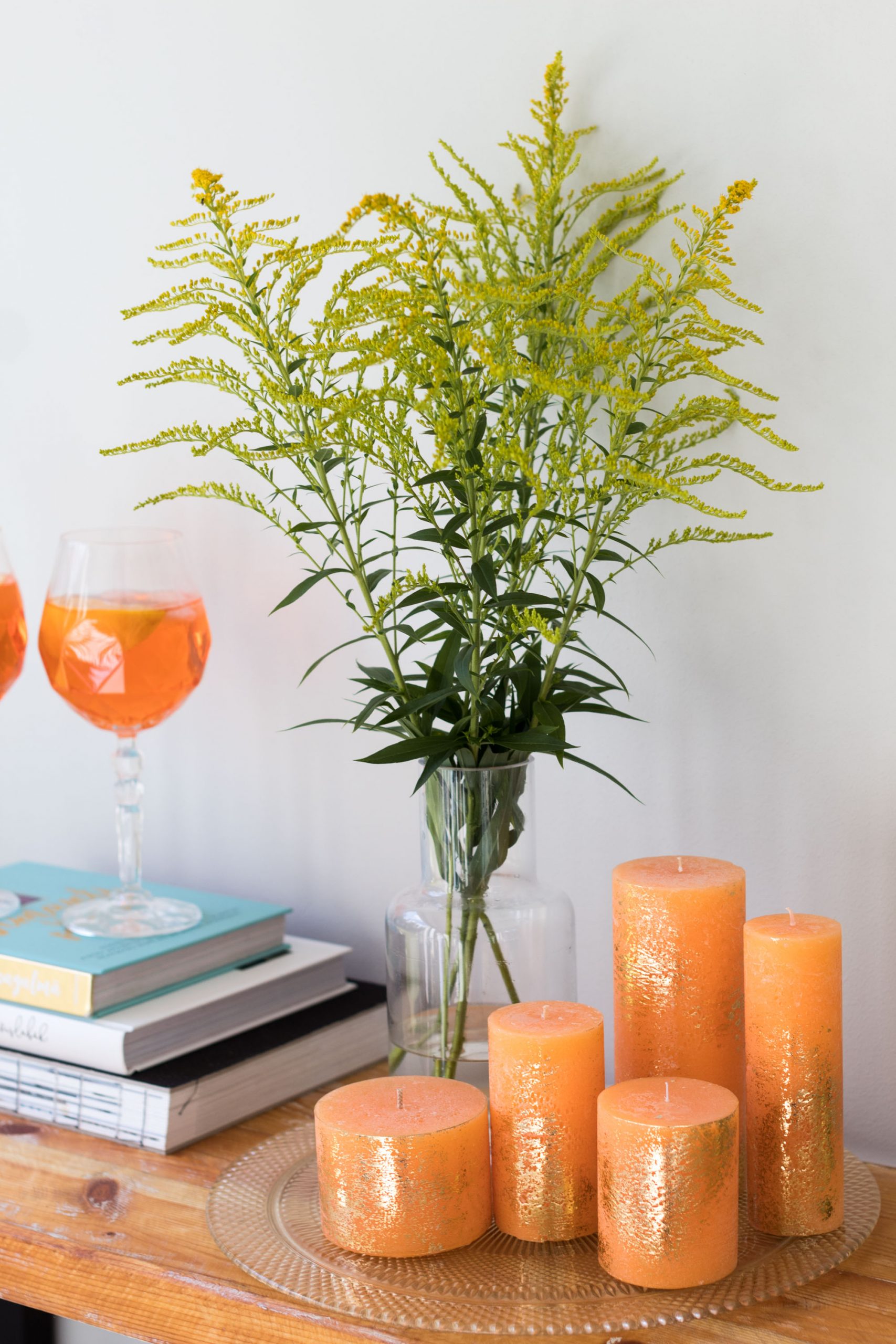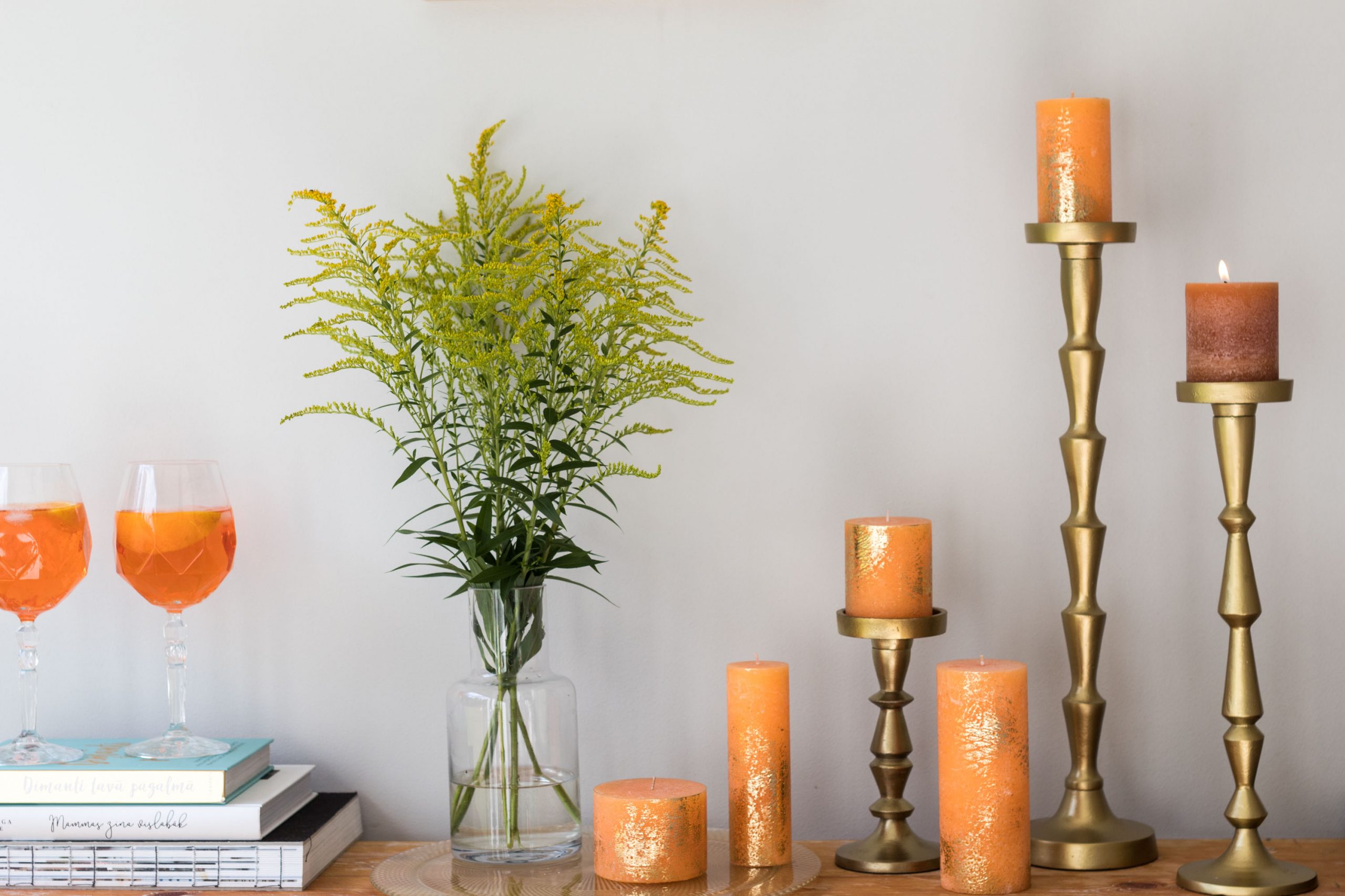 Svece kā mākslas darbs. Zelta raksts tiek veidots ar rokām, līdz ar to katra svece ir unikāla. Gaiši oranžas sveces ienes interjerā radošuma un entuziasma sajūtu.