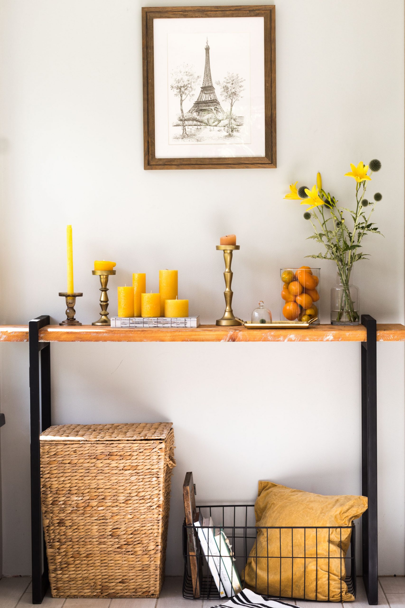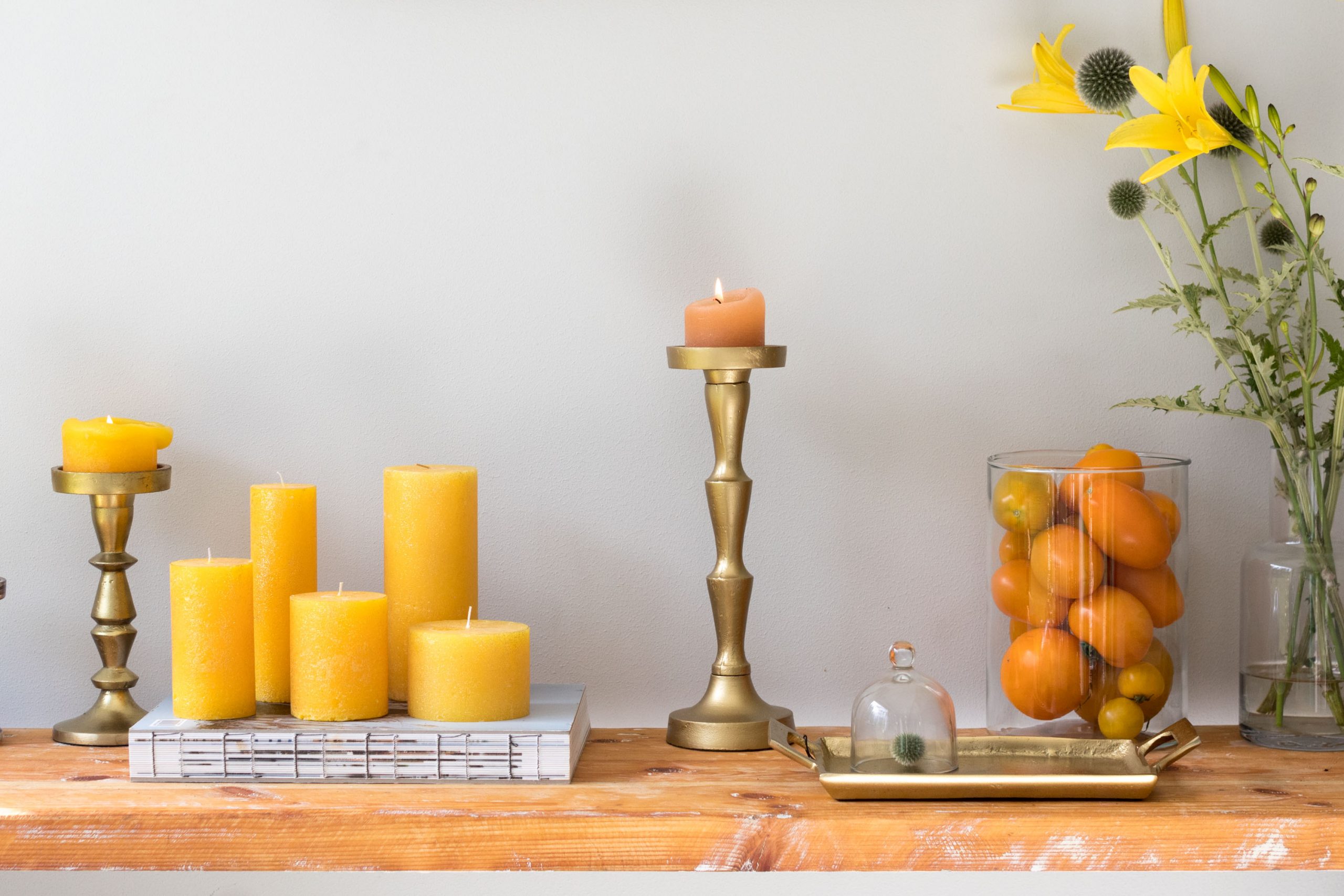 Sveces ar zelta spīdumu sniedz lielāku akcenta un svinīguma noskaņu. Dzeltenas sveces ienes interjerā vitalitātes, dzīvesprieka, komforta un cerības sajūtu.